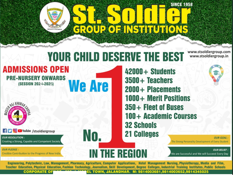 St. Soldier Divine Public School under the aegis of St. Soldier Educational Society offers Master Raj Kanwar Chopra Memorial Scholarships worth Rupees One Crore to deserving students. Every year more than 2000 students who are deprived members of society, meritorious students, Sports Achievers, Extra Curricular Activity achievers receive these scholarships for continuation of their studies.
